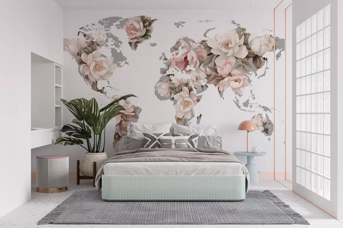 Fototapeten Eine zarte, cremige Weltkarte aus Blumen N° c00008