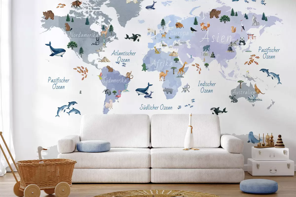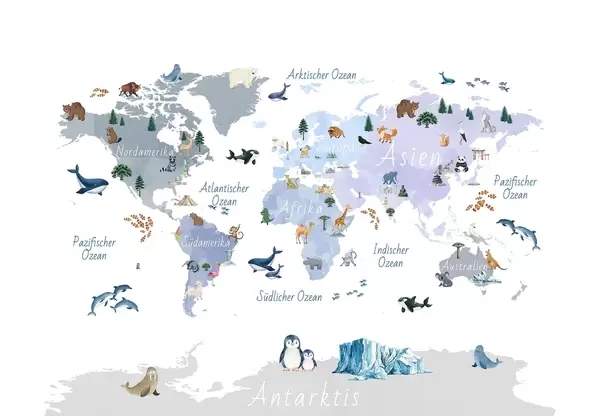 Fototapeten Eine blaue Karte im Aquarellstil mit Tieren, Pflanzen und architektonischen Motiven. Beschriftungen auf Deutsch N° c00009dev1