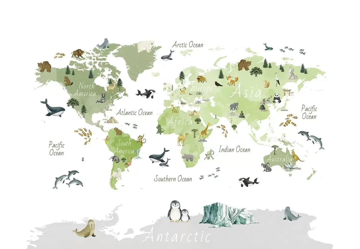 Fototapeten Eine Karte im Aquarellstil, auf der Tiere, Pflanzen und architektonische Elemente dargestellt sind. Beschriftungen auf Englisch N° c00009env2
