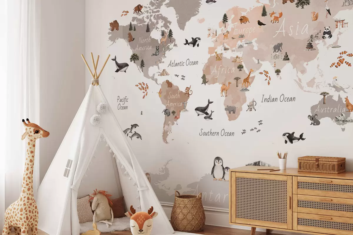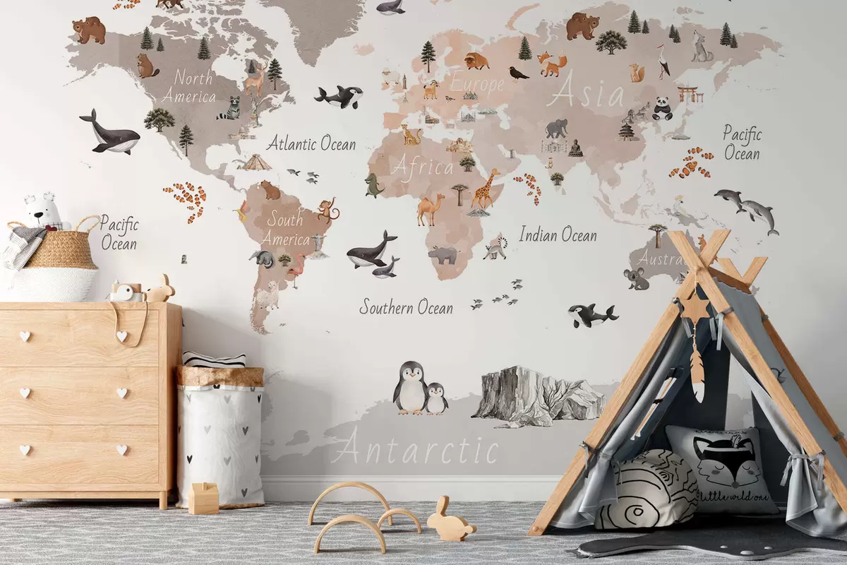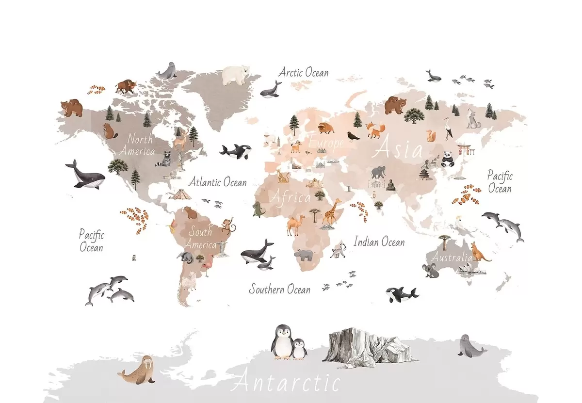 Fototapeten Eine Karte im Aquarellstil in Beige mit Tieren, Pflanzen und architektonischen Motiven. Beschriftungen auf Englisch N° c00009env3