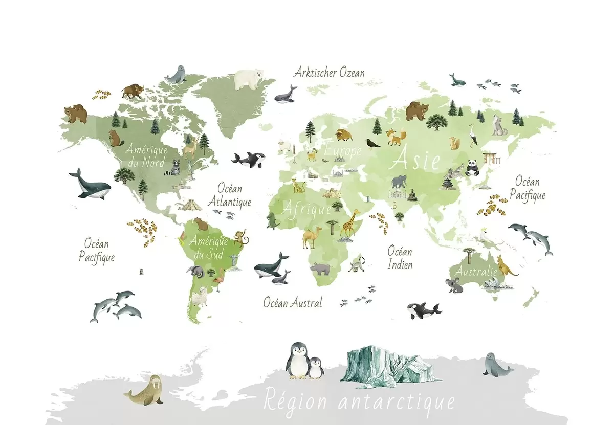 Fototapeten Eine Karte im Aquarellstil, auf der Tiere, Pflanzen und architektonische Elemente dargestellt sind. Beschriftungen auf Französisch N° c00009frv2