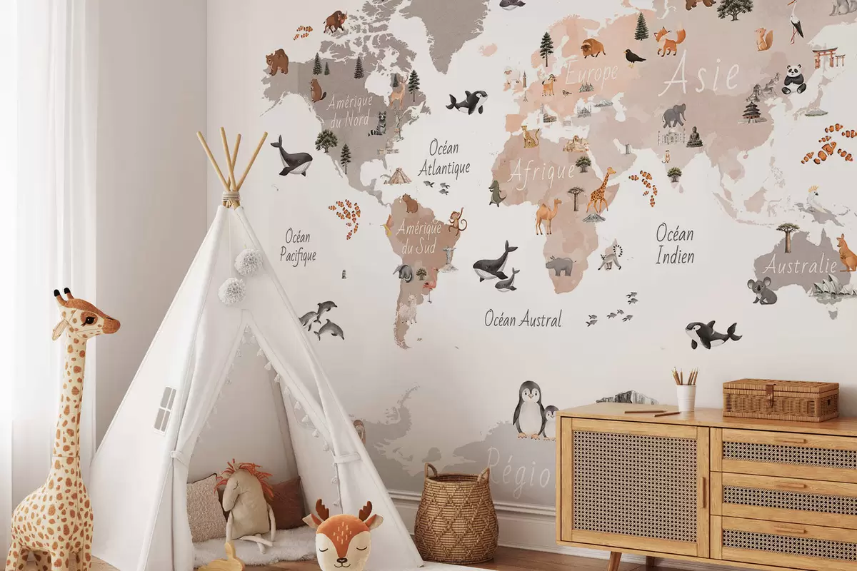 Fototapeten Eine beigefarbene Karte im Aquarellstil mit Tieren, Pflanzen und architektonischen Motiven. Beschriftungen auf Französisch N° c00009frv3