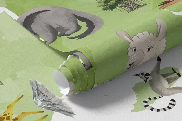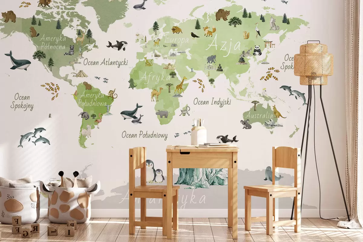 Fototapeten Eine grüne Karte im Aquarellstil mit Tieren, Pflanzen und architektonischen Motiven. Beschriftungen auf Polnisch N° c00009plv2