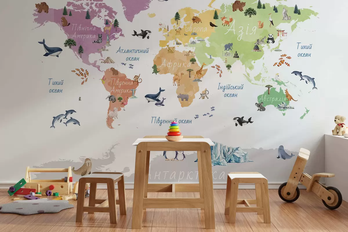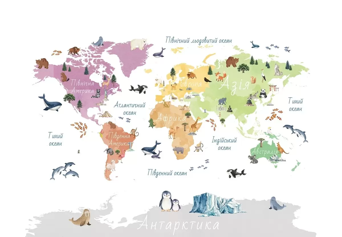 Fototapeten Eine Farbkarte im Aquarellstil mit Tieren, Pflanzen und architektonischen Motiven. Beschriftungen auf Ukrainisch N° c00009uk