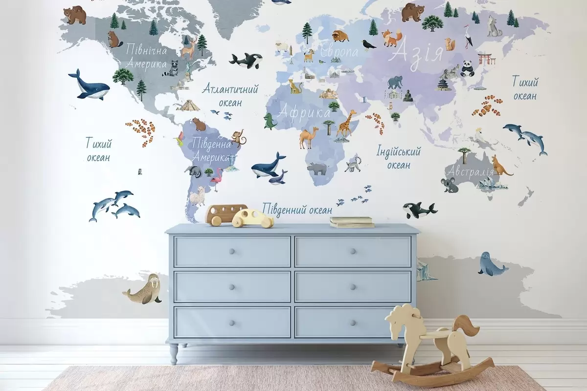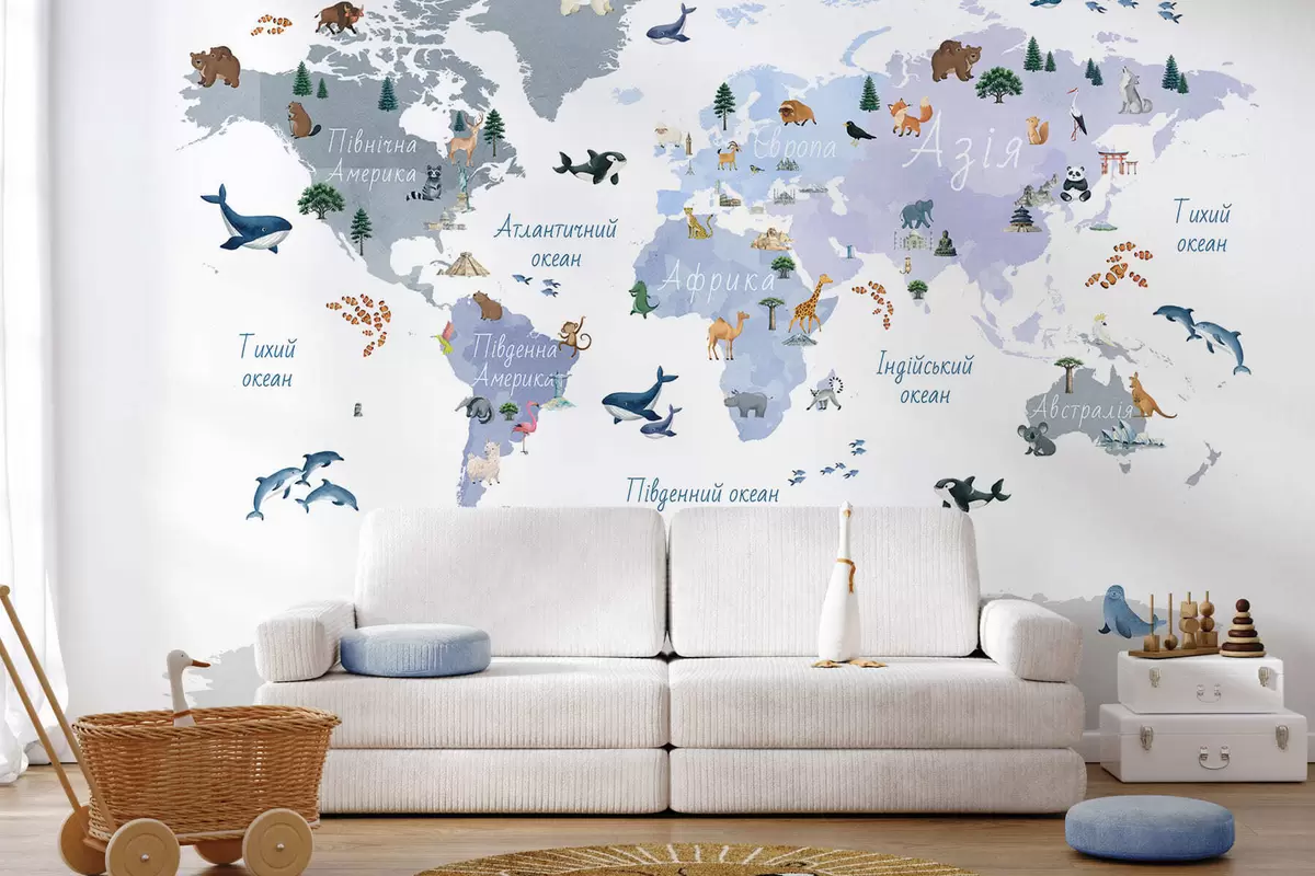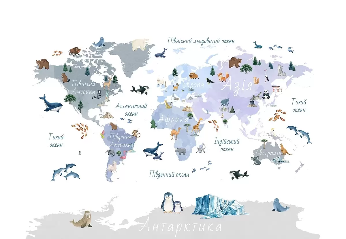 Fototapeten Eine Karte im Aquarellstil in Blau mit Tieren, Pflanzen und architektonischen Motiven. Beschriftungen auf Ukrainisch N° c00009ukv1