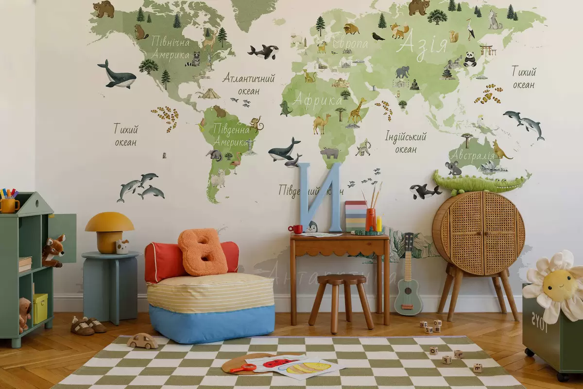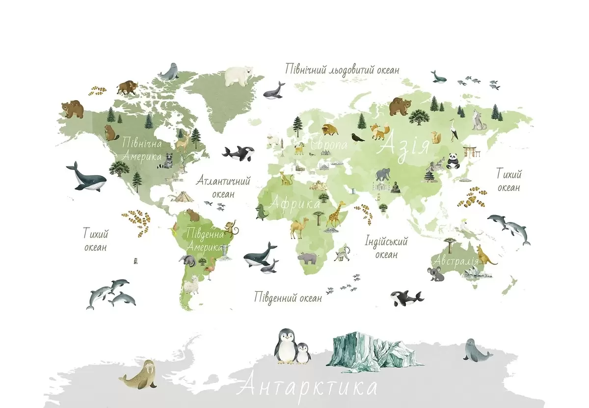Fototapeten Eine Karte im Aquarellstil, die Tiere, Pflanzen und Architektur zeigt. Beschriftungen auf Ukrainisch N° c00009ukv2