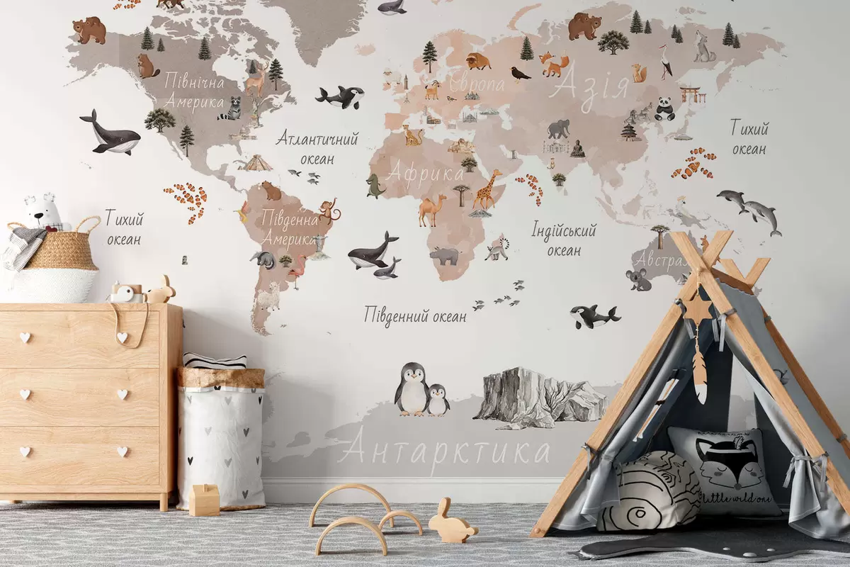 Fototapeten Eine Karte im Aquarellstil in Beige mit Tieren, Pflanzen und architektonischen Motiven. Beschriftungen auf Ukrainisch N° c00009ukv3