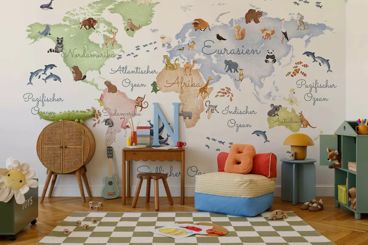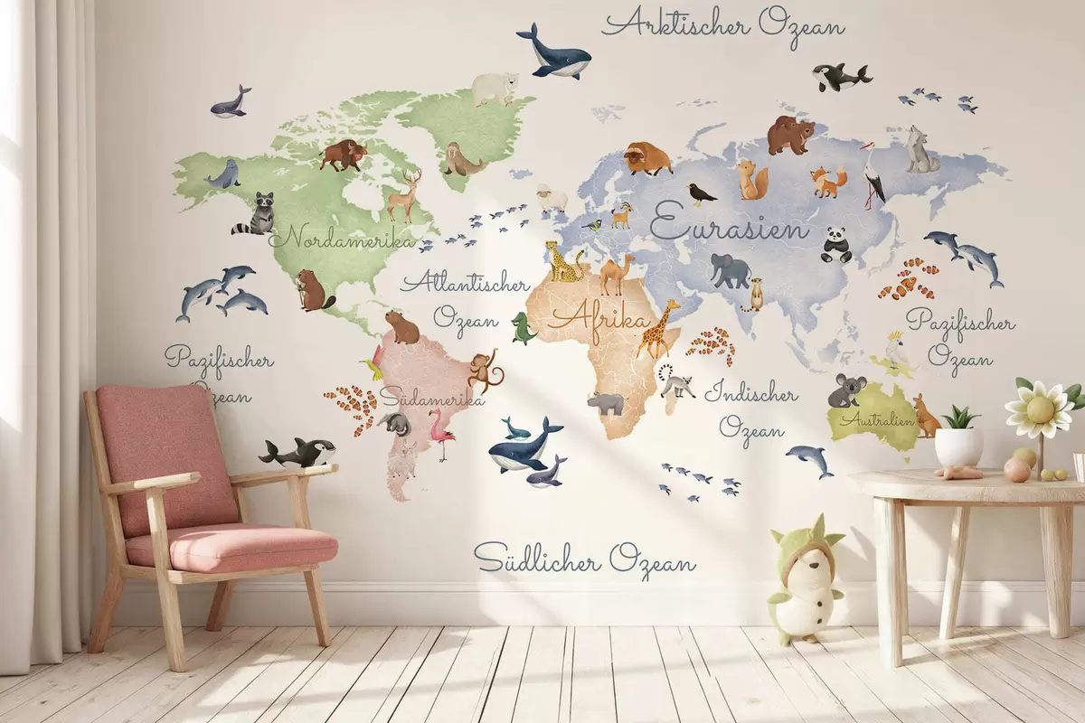 Fototapeten Eine Karte im Aquarellstil mit Tieren. Beschriftungen auf Deutsch N° c00012de