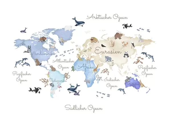 Fototapeten Eine blaue Karte im Aquarellstil mit Tiermotiven. Beschriftungen auf Deutsch N° c00012dev1