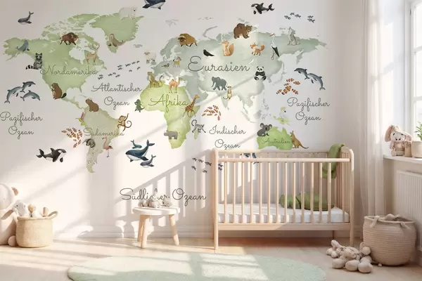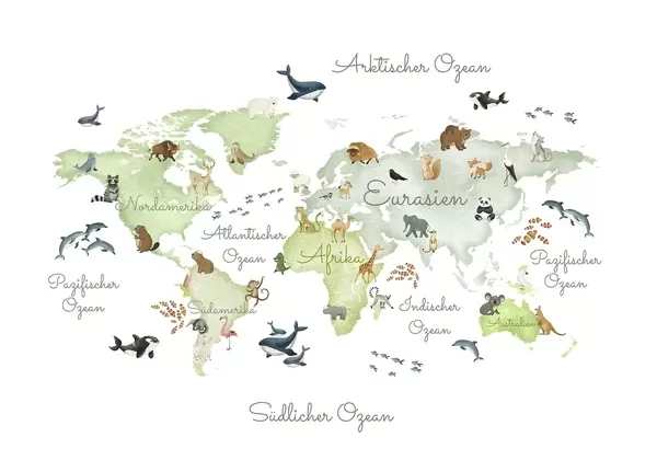 Fototapeten Eine grüne Karte im Aquarellstil mit Tiermotiven. Beschriftungen auf Deutsch N° c00012dev2