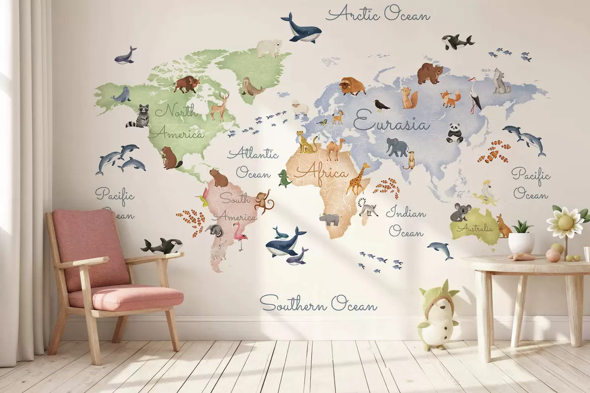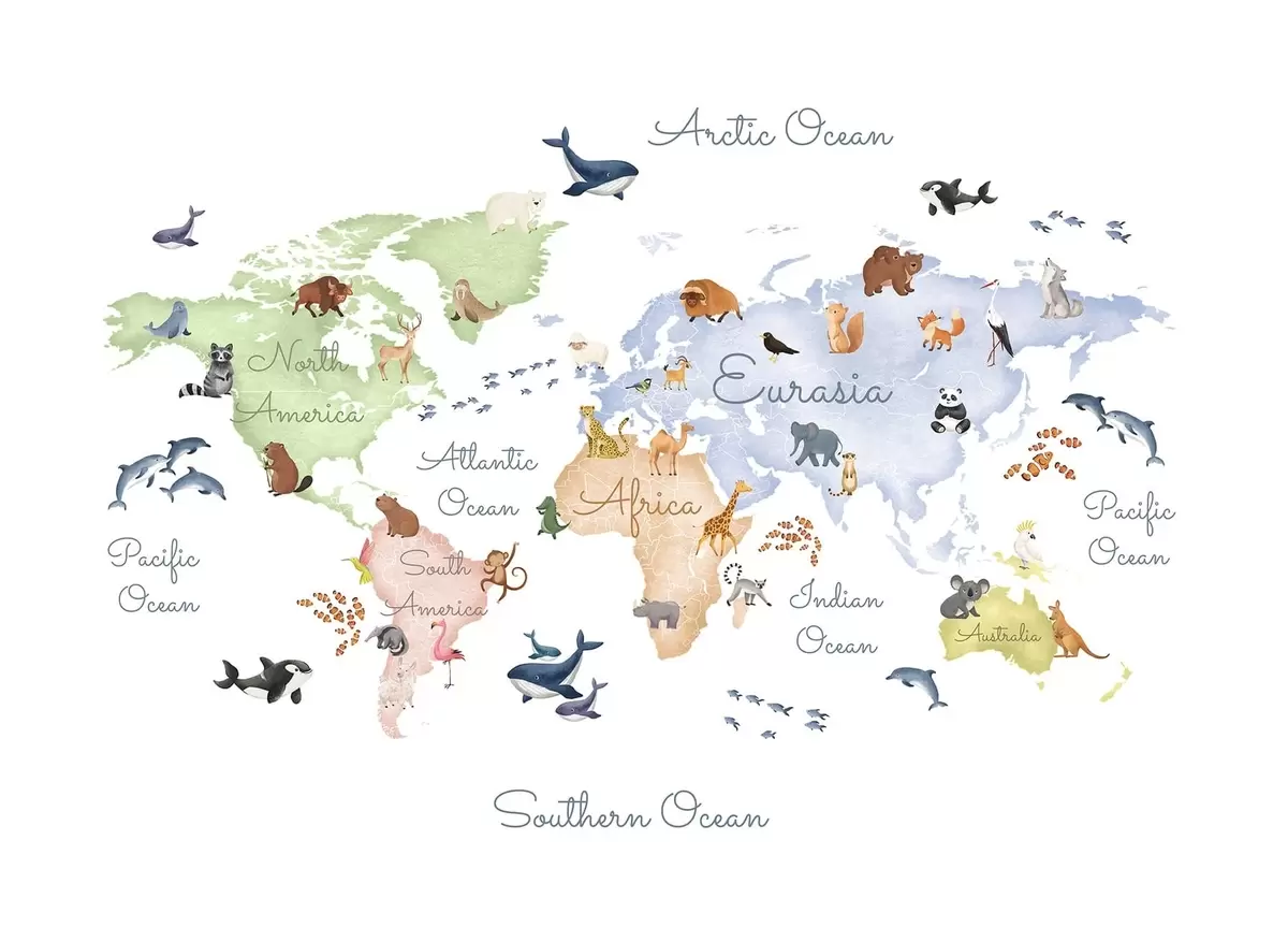 Fototapeten Eine Farbkarte im Aquarellstil mit Tiermotiven. Beschriftungen auf Englisch N° c00012en