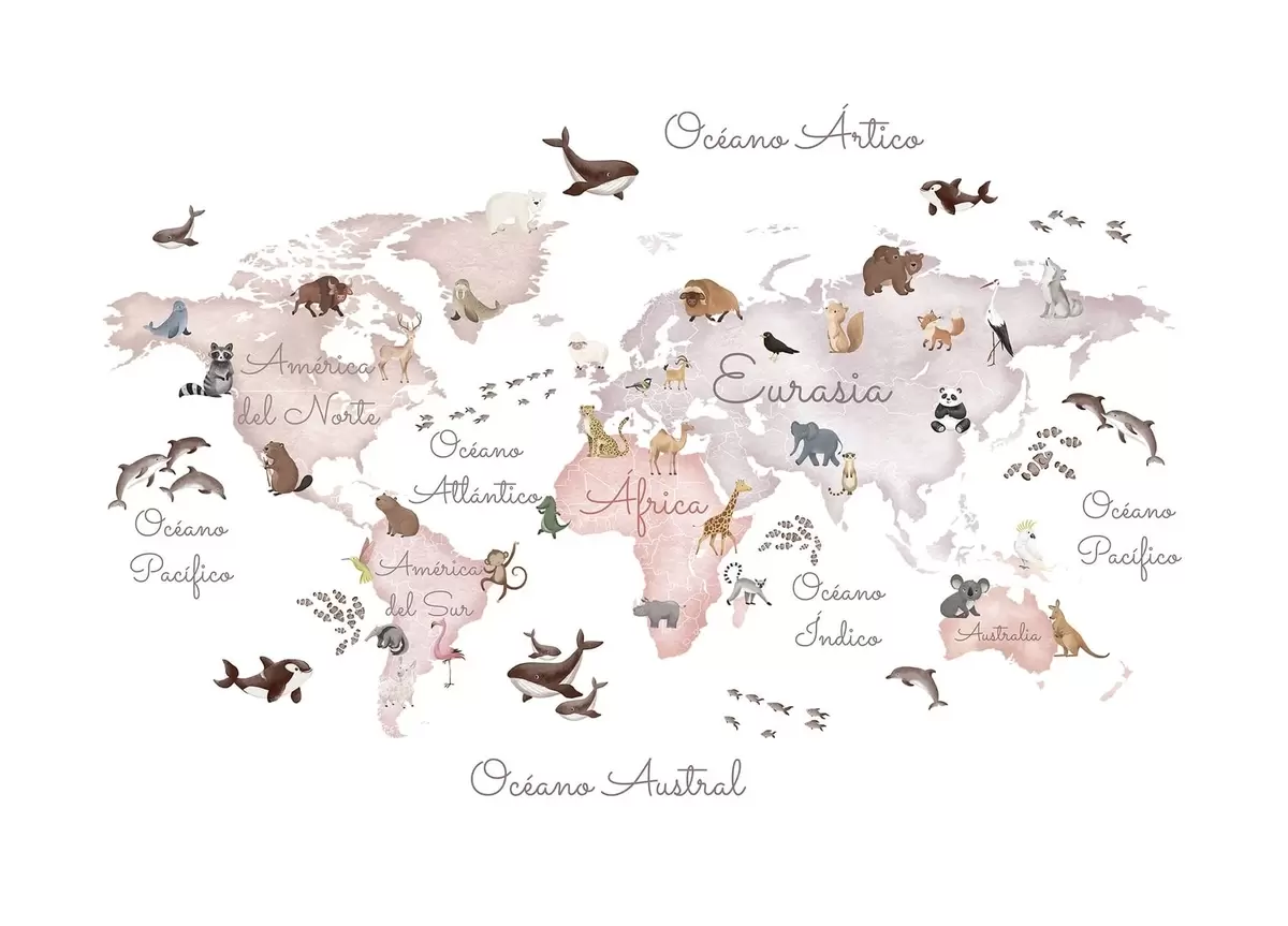 Fototapeten Eine beigefarbene Karte im Aquarellstil mit Tiermotiven. Beschriftungen auf Spanisch N° c00012esv3