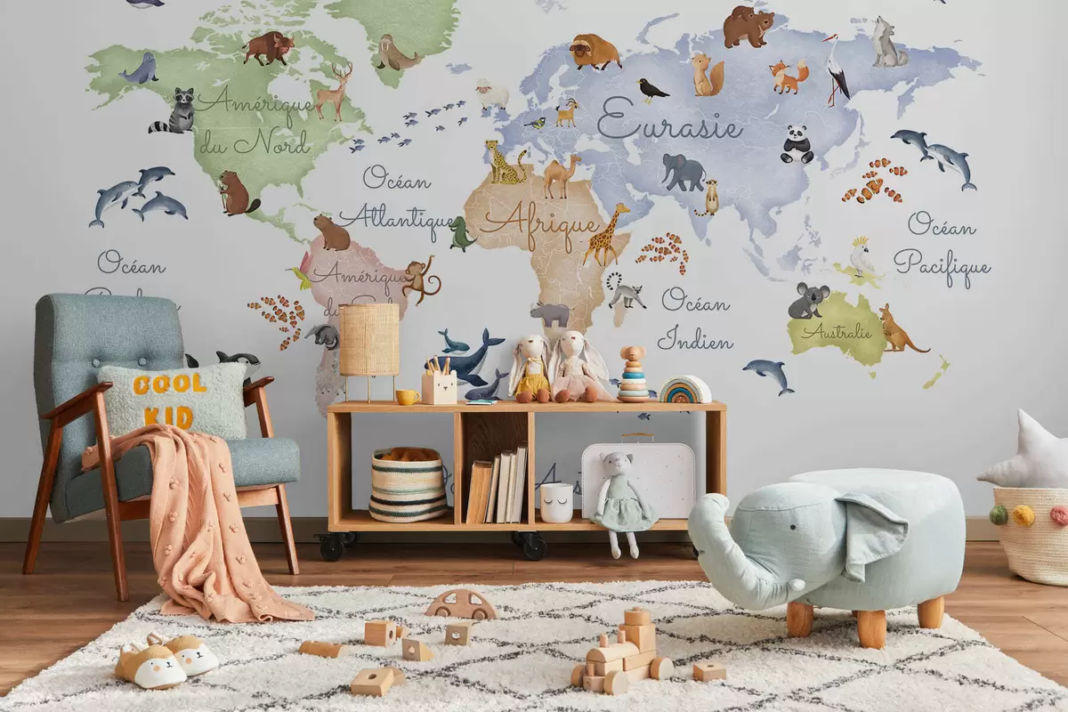 Fototapeten Eine Farbkarte im Aquarellstil mit Tiermotiven. Beschriftungen auf Französisch N° c00012fr