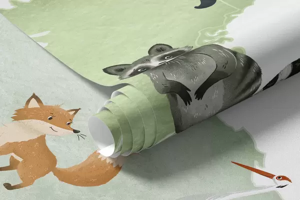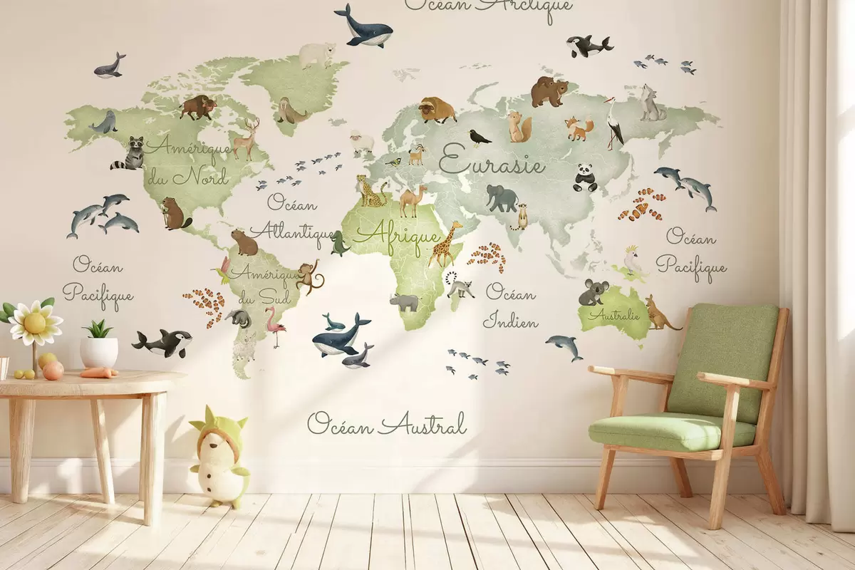 Fototapeten Eine grüne Karte im Aquarellstil mit Tiermotiven. Beschriftungen auf Französisch N° c00012frv2