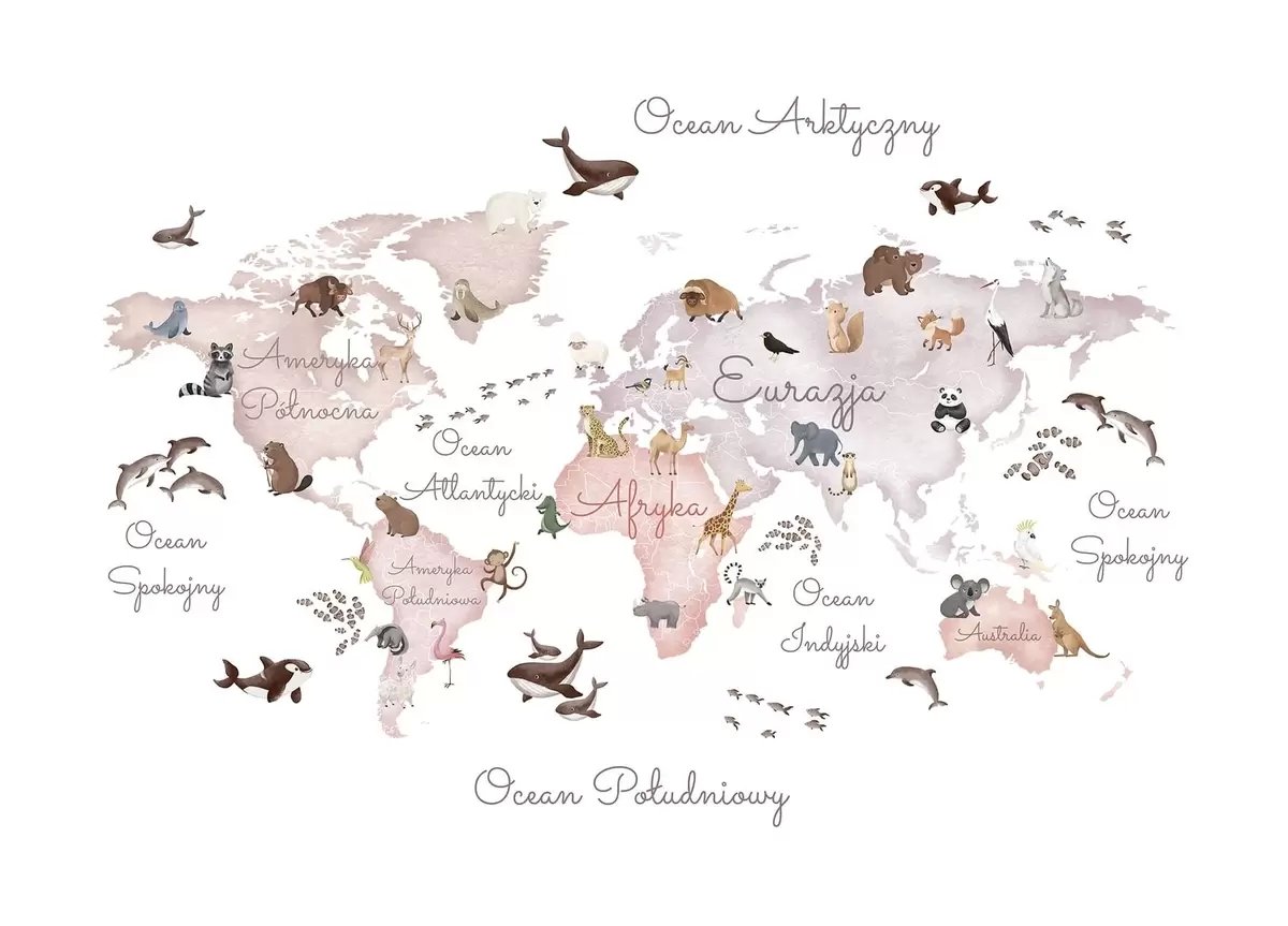 Fototapeten Eine beigefarbene Karte im Aquarellstil mit Tiermotiven. Beschriftungen auf Polnisch N° c00012plv3