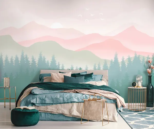Fototapeten Neblige Berge mit Kiefernwald, weiche natürliche Farben, Rosa und Grün N° u98774
