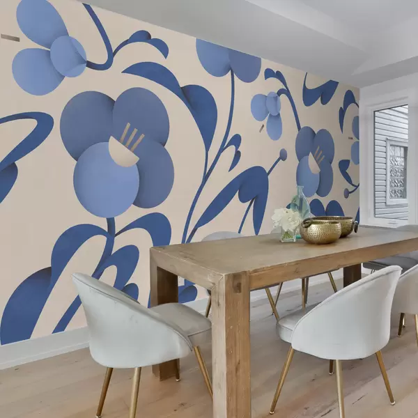 Fototapeten Botanischer Druck mit dekorativen blauen Blumen auf beigem Hintergrund N° u99196v7
