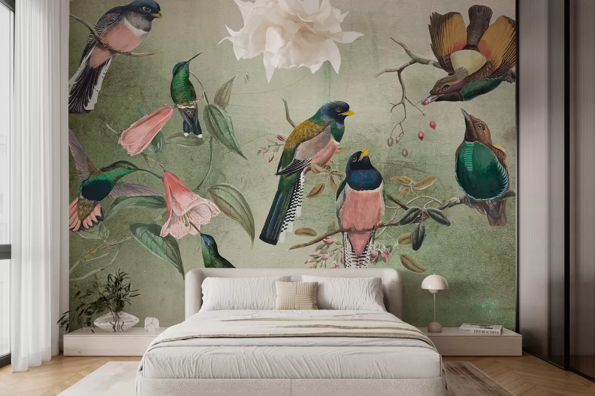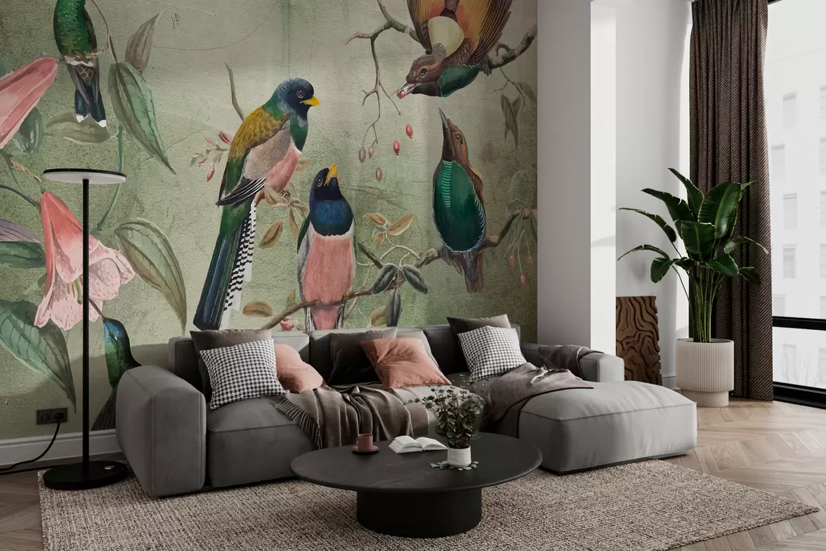Fototapeten Eine Gruppe bunter Vögel, die auf Ästen im strukturierten Hintergrund sitzen N° w00543