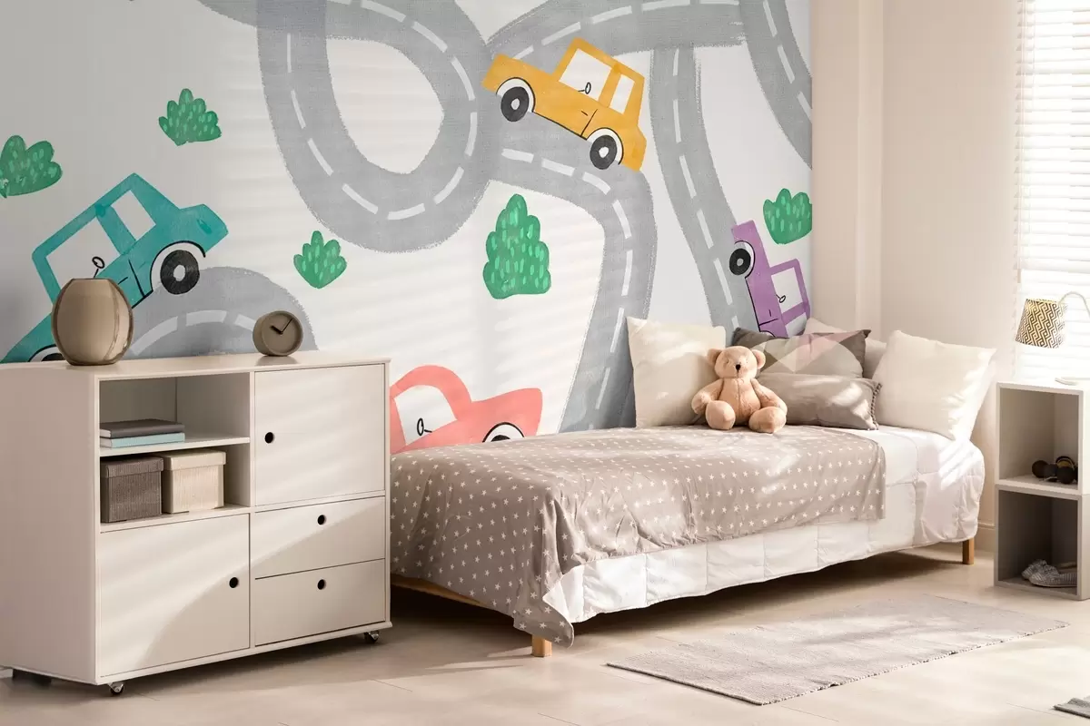 Fototapeten Bunte Autos auf einer kurvenreichen Straße N° w00599