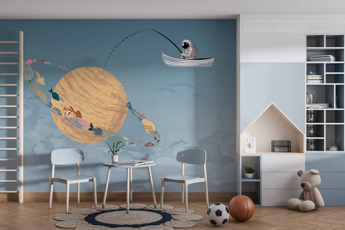Fototapeten Astronaut Mond und Fisch in blau N° w00869v1