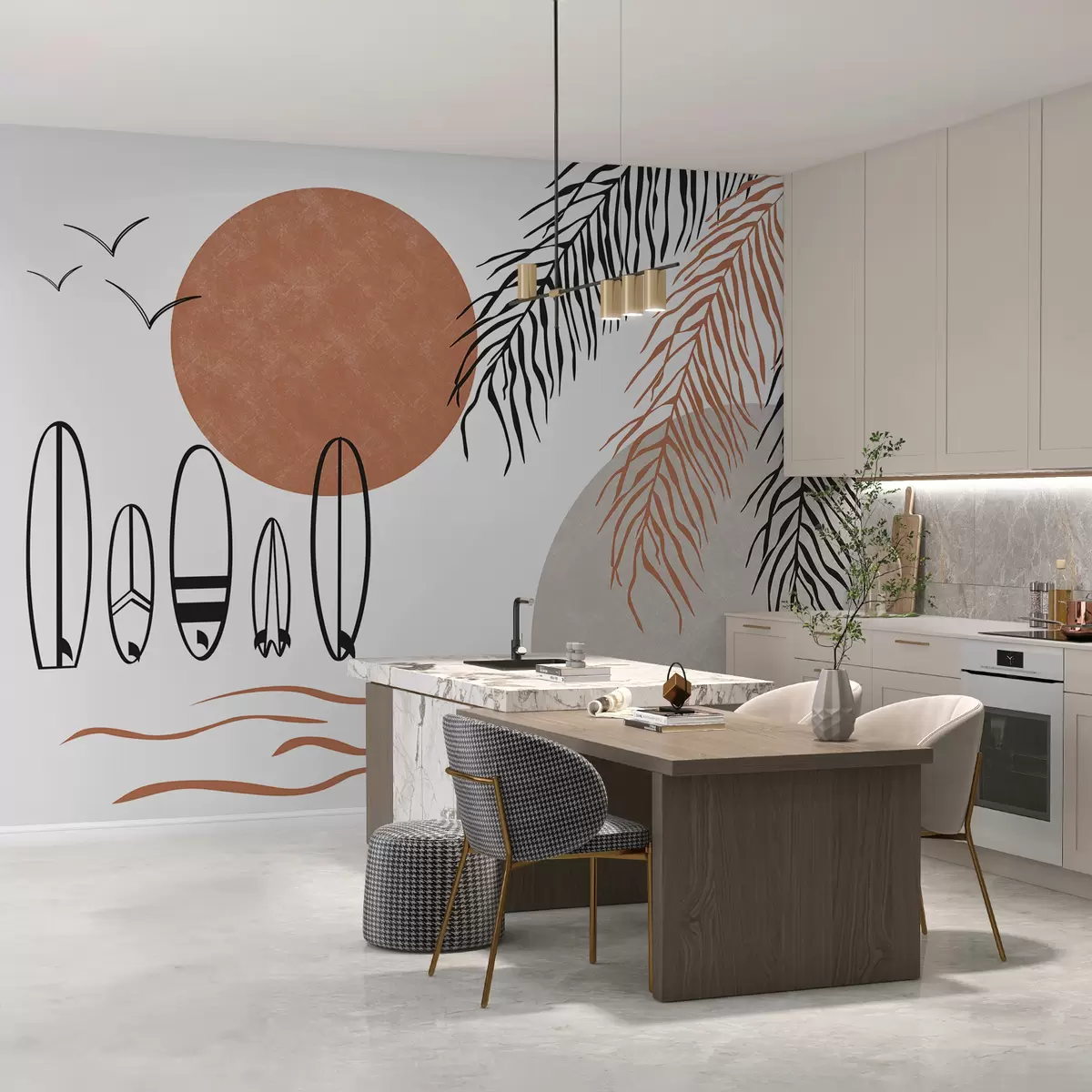 Fototapeten Surfbretter, Palmzweige Strichzeichnung, schwarze und rote Farbe N° w00958