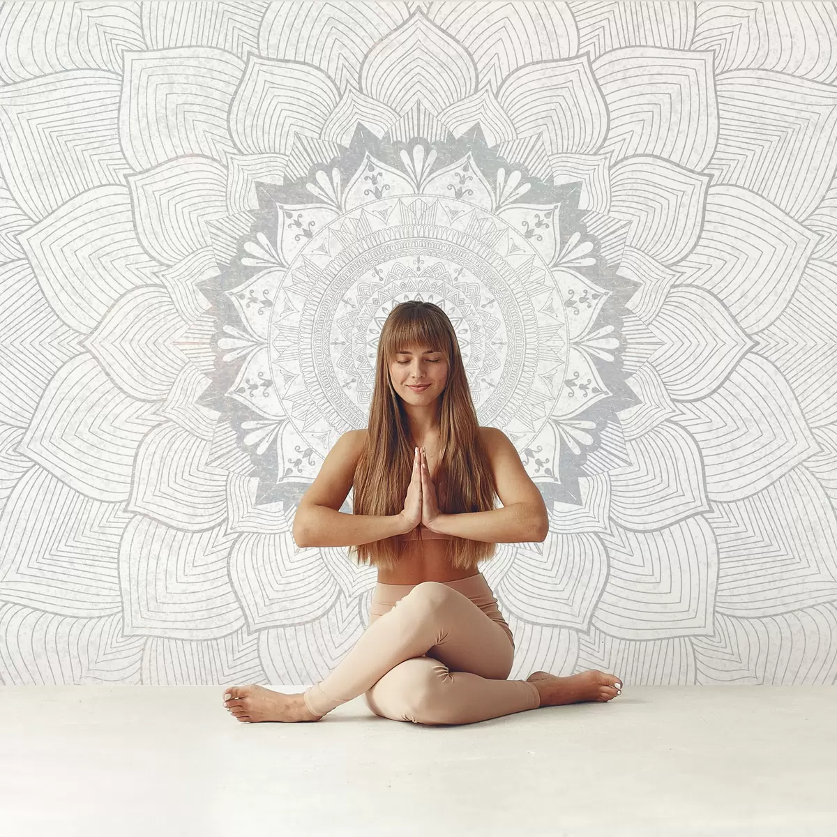 Fototapeten Rundes Mandala, Tapete für den Yogaraum oder zur Harmonisierung des persönlichen Raums. Wand Mandala in Grautönen auf einem strukturierten heterogenen Hintergrund N° w01088v2