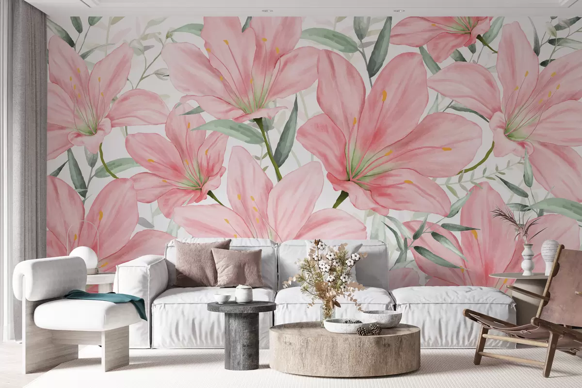 Fototapeten Große blassrosa Lilien und Blätter in Aquarell-Stil auf einem weißen Hintergrund N° w01121
