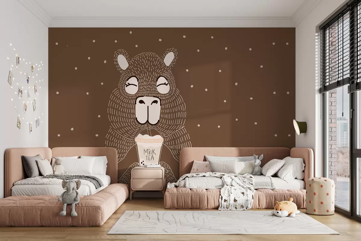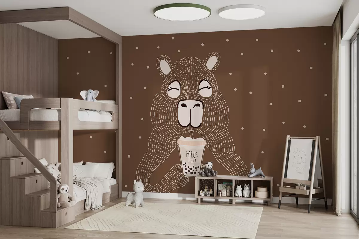 Fototapeten Große niedliche Capybara mit Blase Tee in minimalistischen Punkt-Stil auf einem braunen gepunkteten Hintergrund N° w01122v2