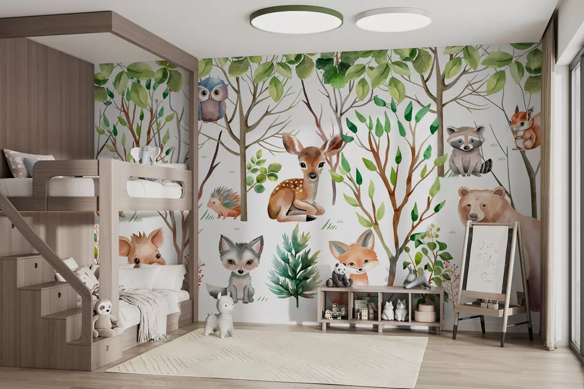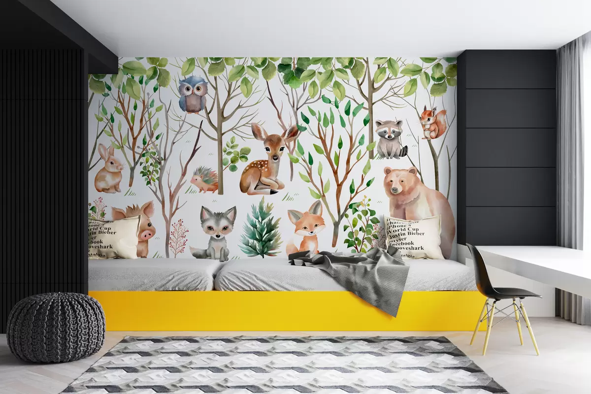 Fototapeten Kindertapete Tiere des Waldes. Farbige Tapete auf einem weißen Hintergrund N° w01127