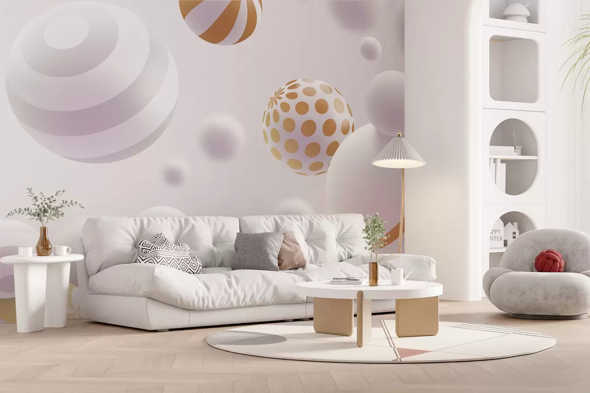 Fototapeten Volumetrische fliegende Kugeln im 3D-Stil in hellen Grautönen mit orangefarbenen Akzenten N° w01148