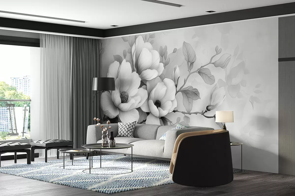 Fototapeten Eine schwarz-weiße Abbildung einer Magnolie auf grauem Hintergrund N° w01277