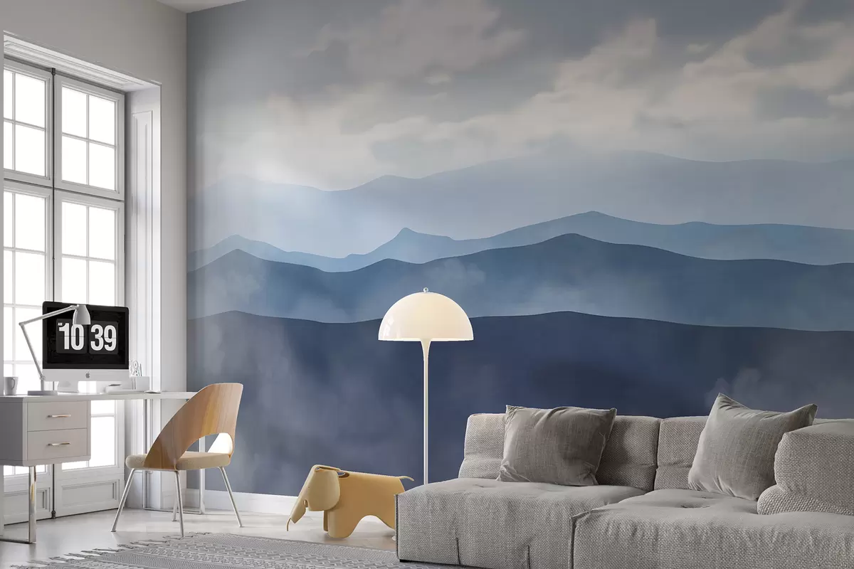 Fototapeten Neblige minimalistische Berglandschaft mit sanften Hügeln und bewölktem Himmel N° w01317