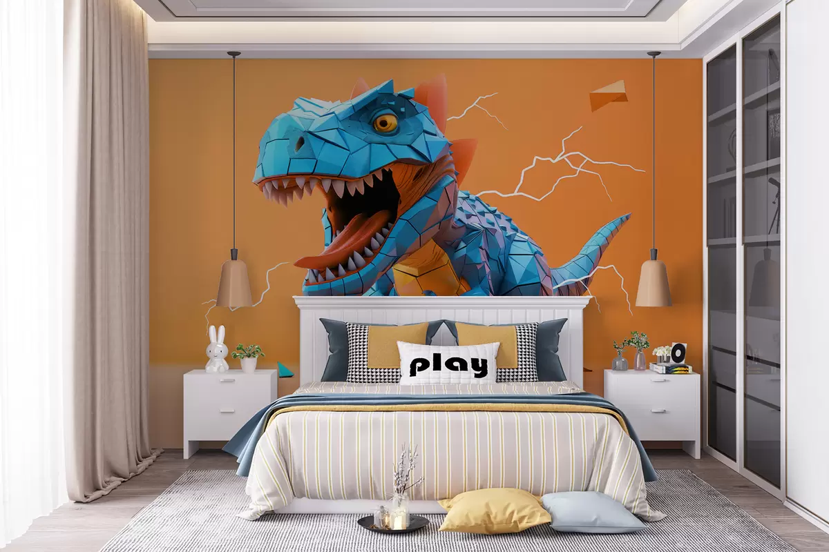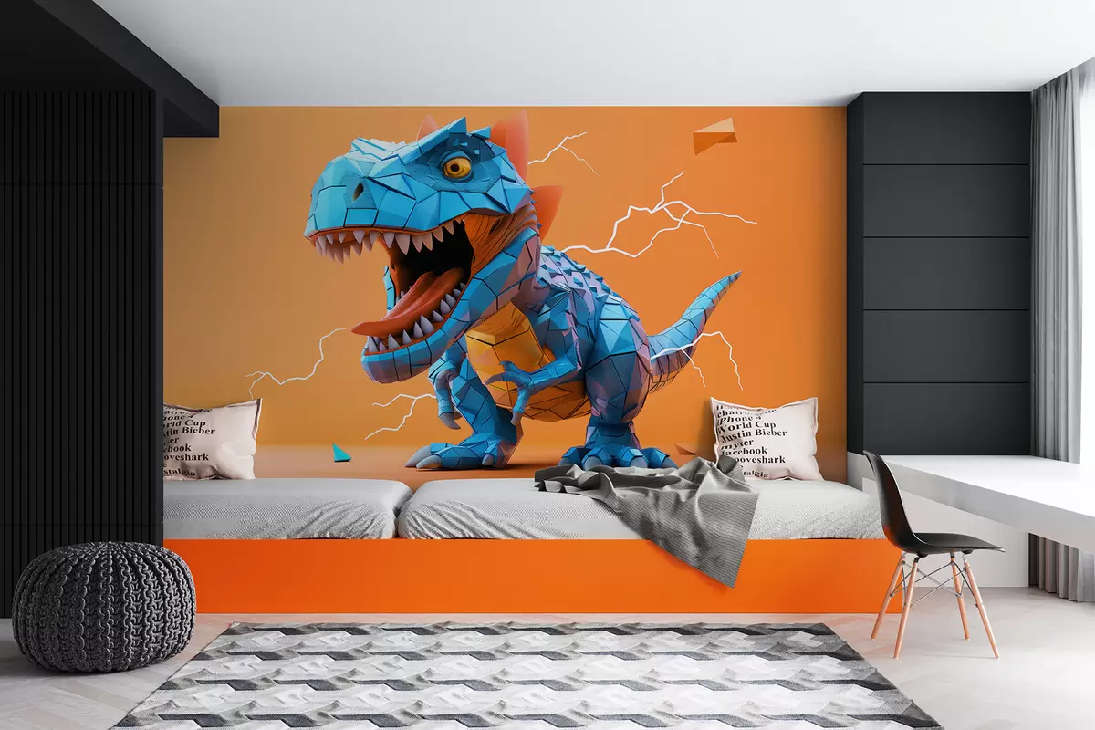 Fototapeten Wilder Dinosaurier mit Blitzeinschlag in den Farben Gelb und Blau N° w01333v1