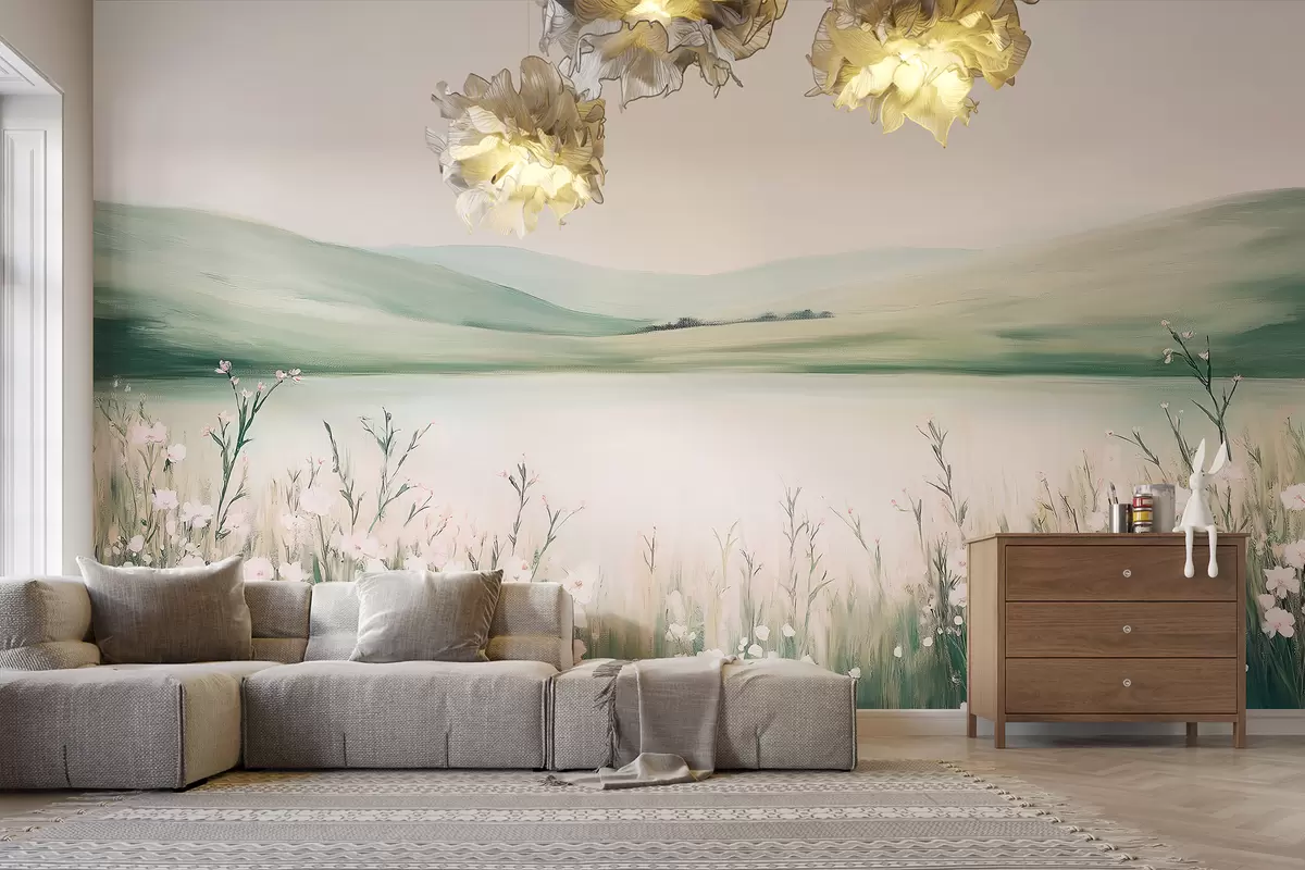 Fototapeten Blumenwiese, Naturlandschaft, See, rosa Blumen, grüne Hügel N° w01387