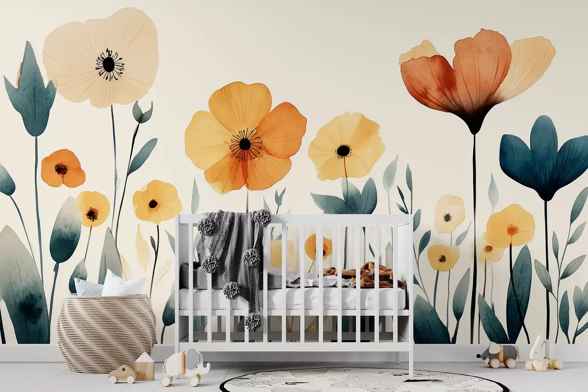 Fototapeten Aquarell Wiesenblumen, rustikal, florale Komposition, einfache Zeichnung, Beige, Orange, Blau N° w01453
