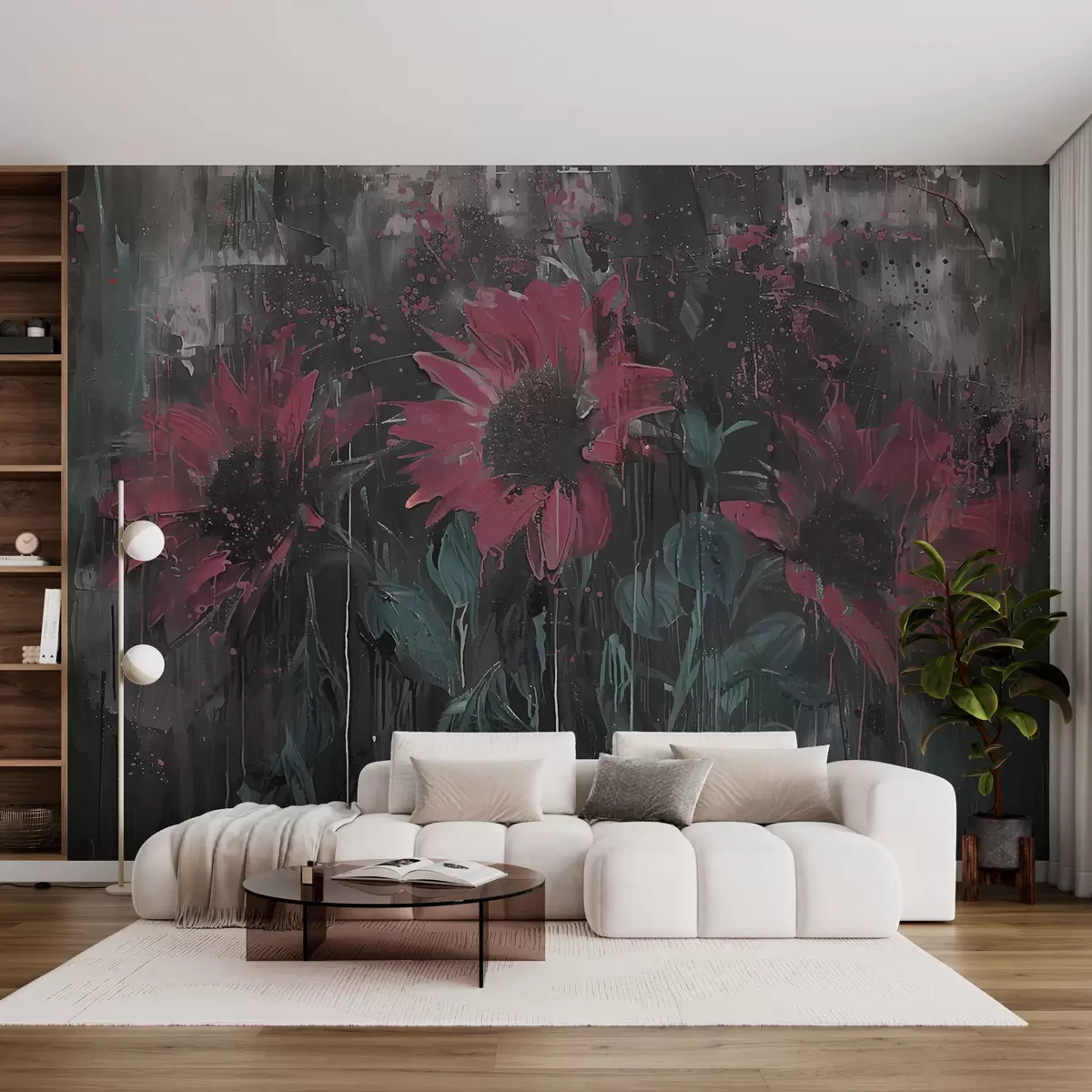 Fototapeten Abstraktes Sonnenblumenbild, dunkelgrauer Hintergrund und rot-rosa Töne N° w01480v1