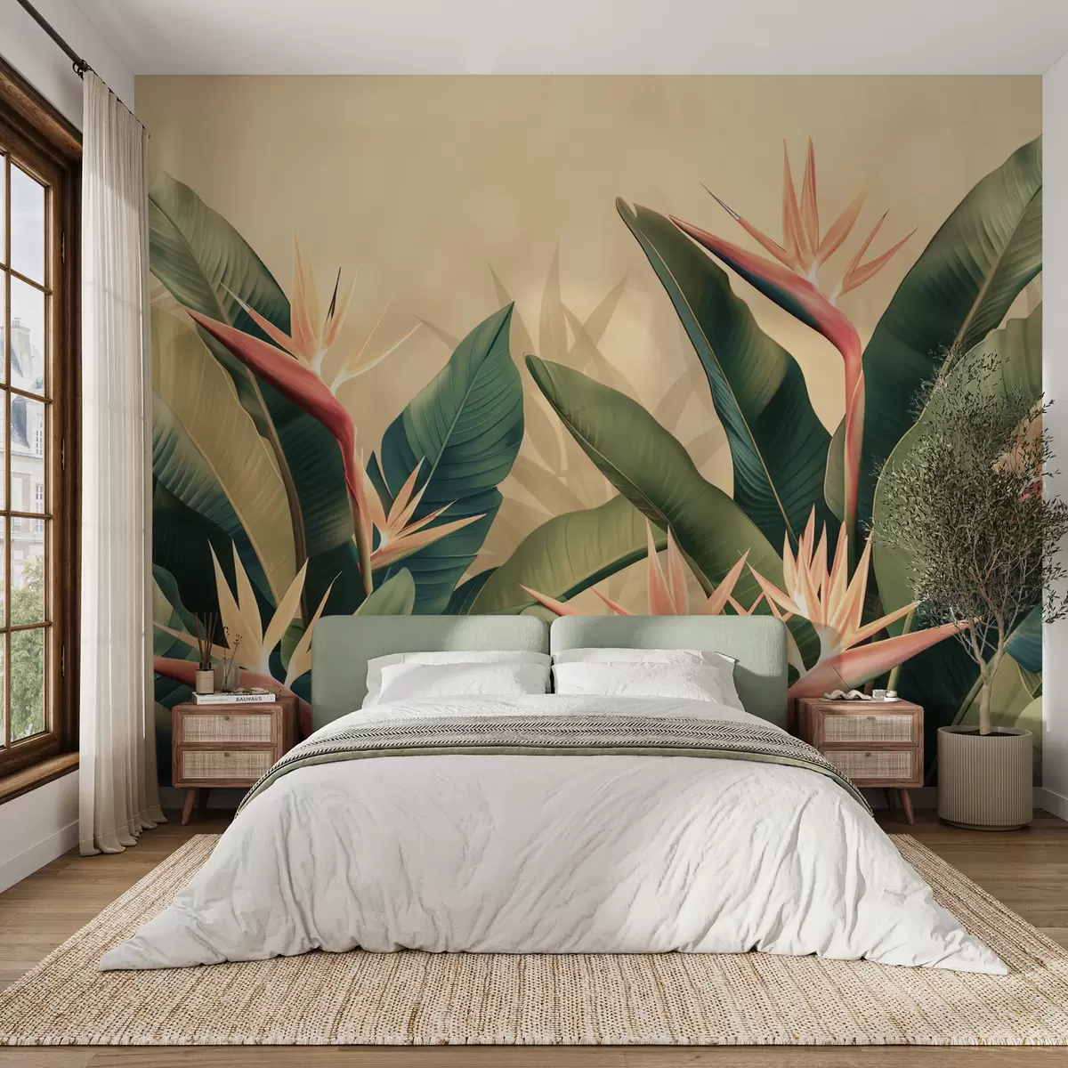 Fototapeten Üppiges Arrangement aus tropischen Blumen, umgeben von großen dunkelgrünen Blättern N° w01484v1