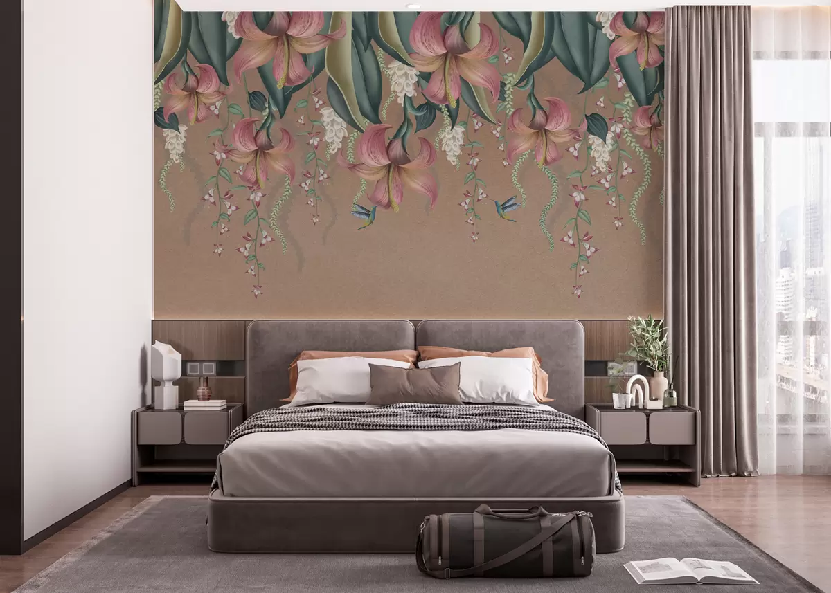 Fototapeten Zartes botanisches Motiv mit hängenden Lilien, Blumen und Kolibris auf einer Grunge-Wand N° w01523