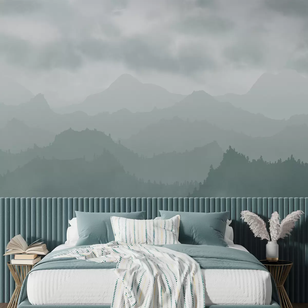 Fototapeten Neblige Berge mit blauen Cirruswolken am Himmel N° w01637v2