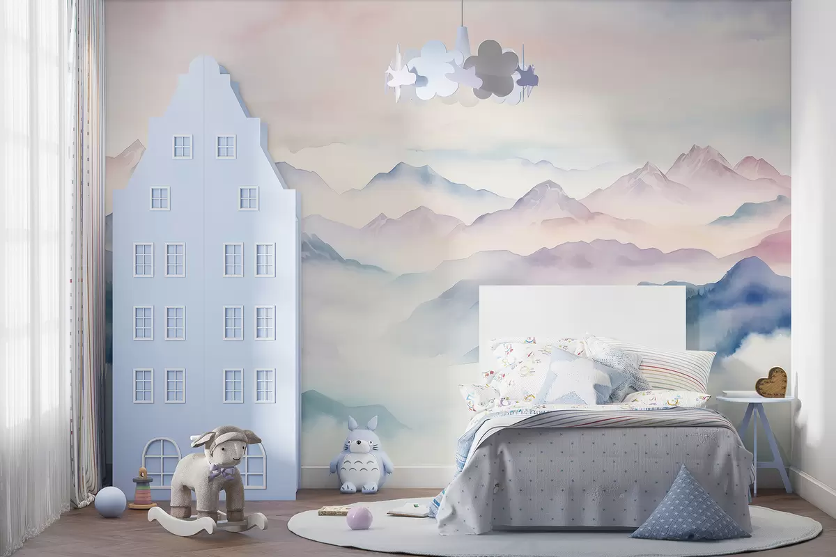 Fototapeten Ätherische Berglandschaft, Wolken, Aquarell N° w01791