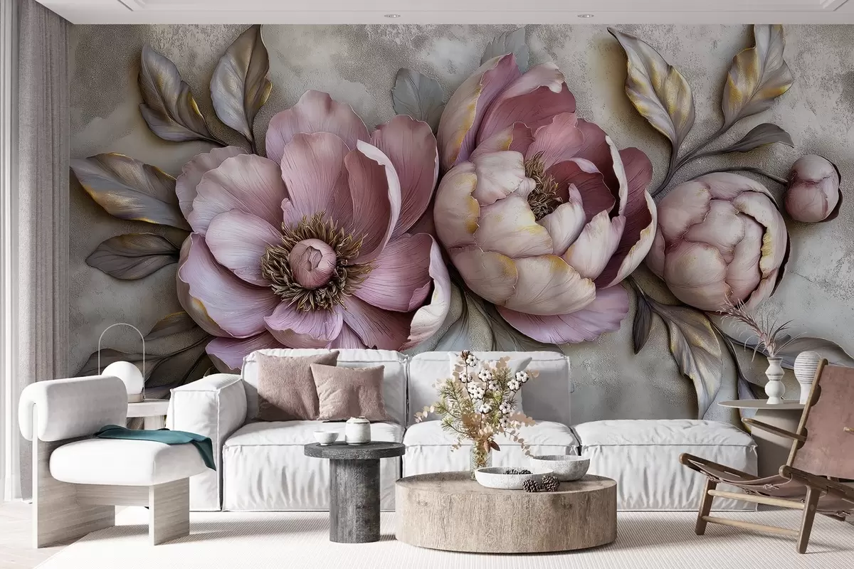 Fototapeten Floral lila Pfingstrosen mit Blättern und Blütenblätter in gedämpften Pastellfarben, Vintage-Stil N° w01825