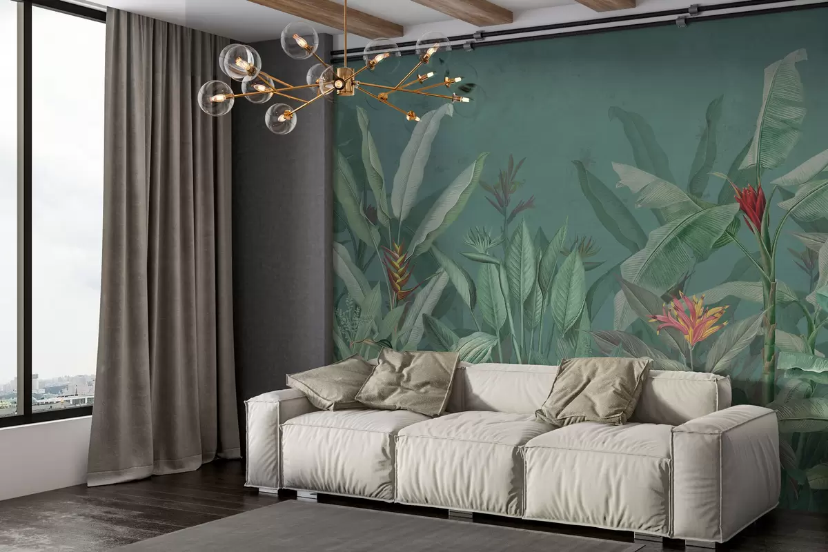 Fototapeten Tropische Blätter und Blumen auf einem grünen Hintergrund N° w01834v2