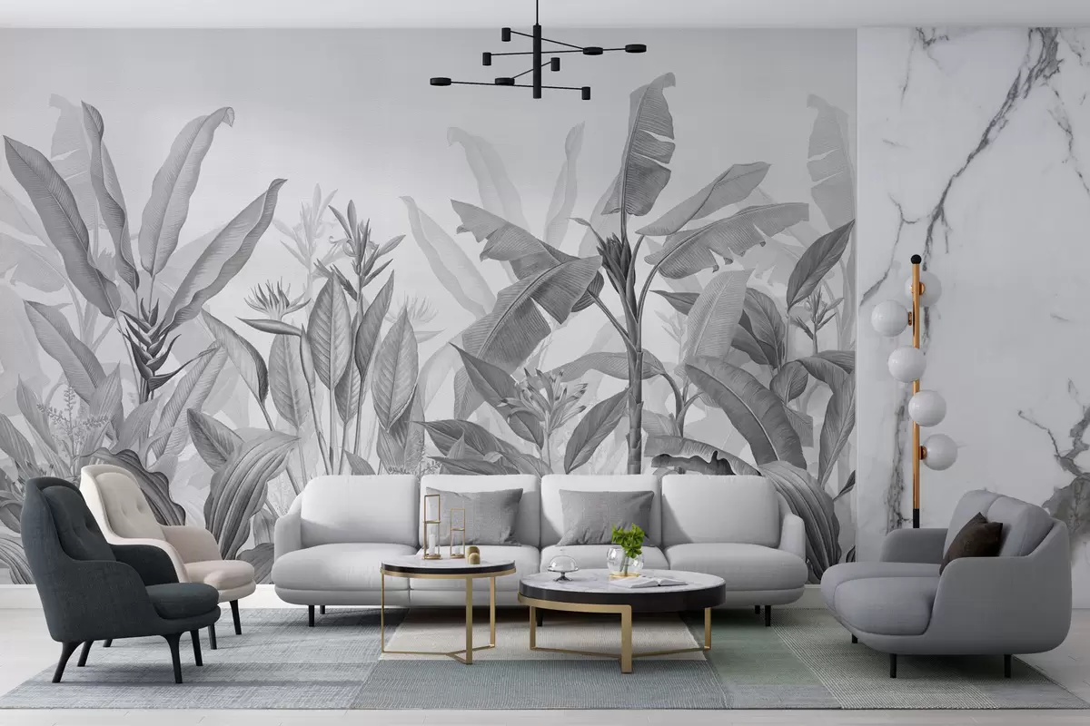 Fototapeten Schwarze und weiße tropische Blätter und Blumen auf einem hellen Hintergrund N° w01834v3