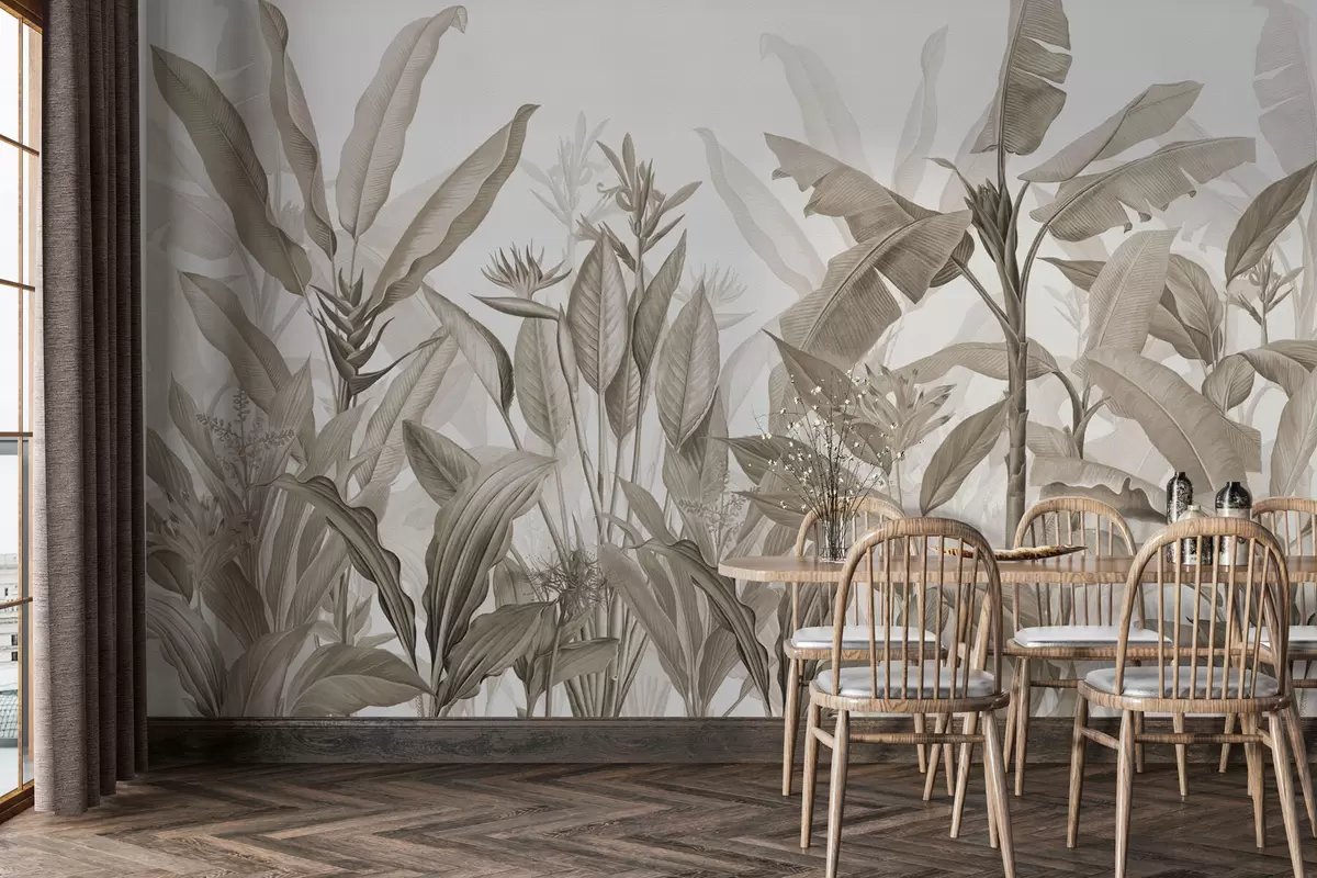 Fototapeten Tropische Blätter und Blumen auf einem hellen Hintergrund in Sepia-Stil N° w01834v4
