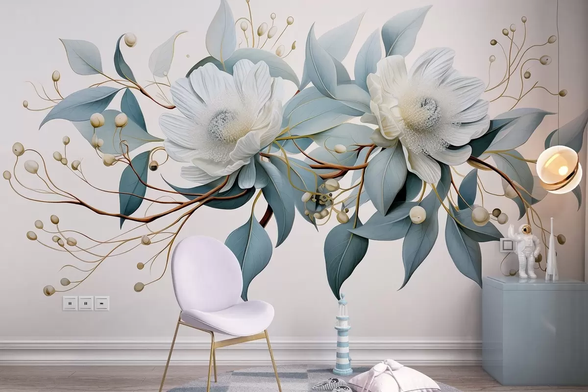 Fototapeten Schöne Acryl Blumen mit Blättern und Beeren, Realismus N° w01887