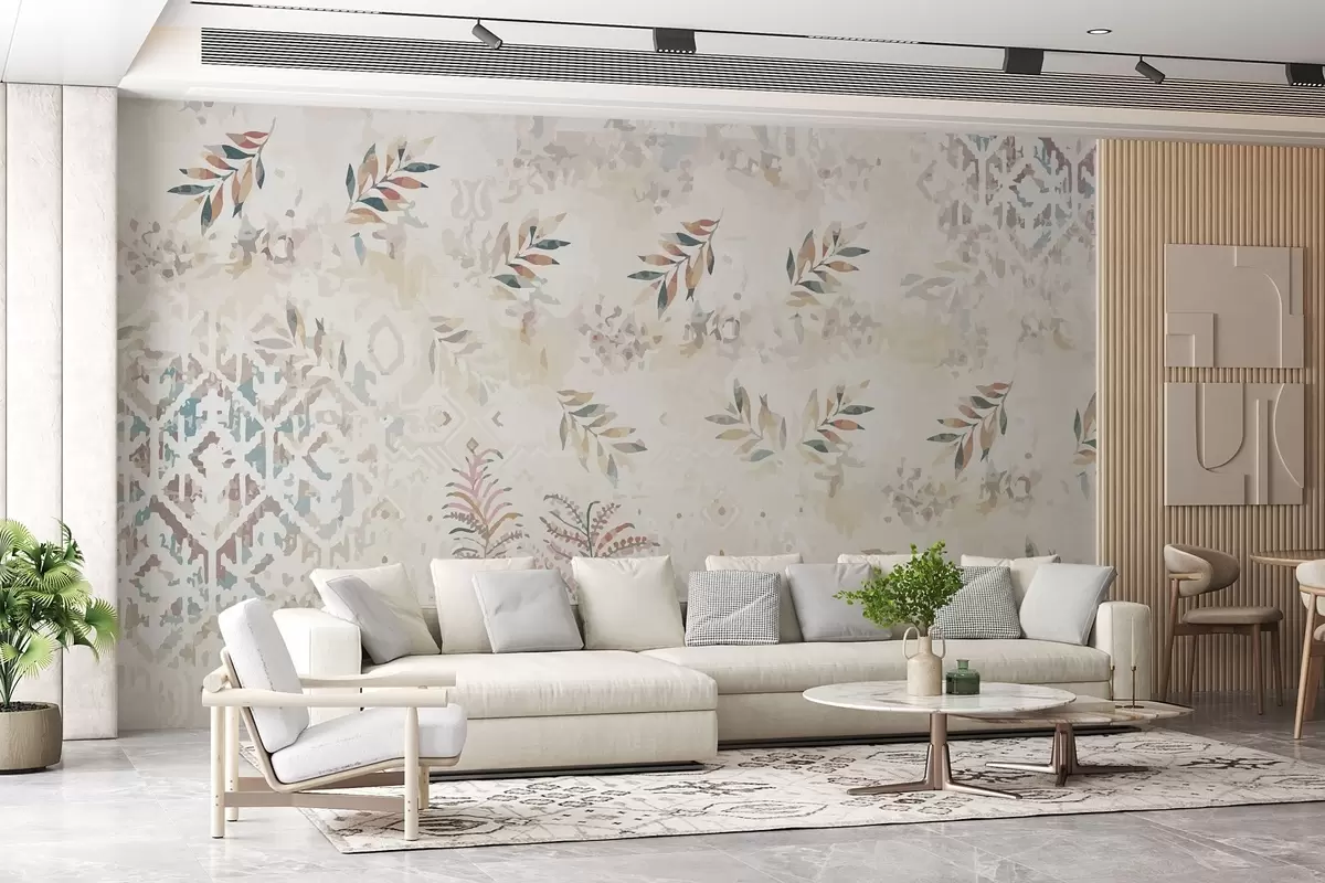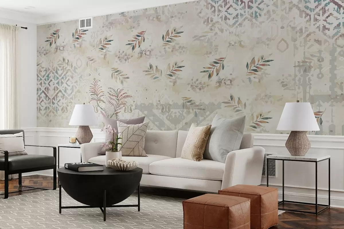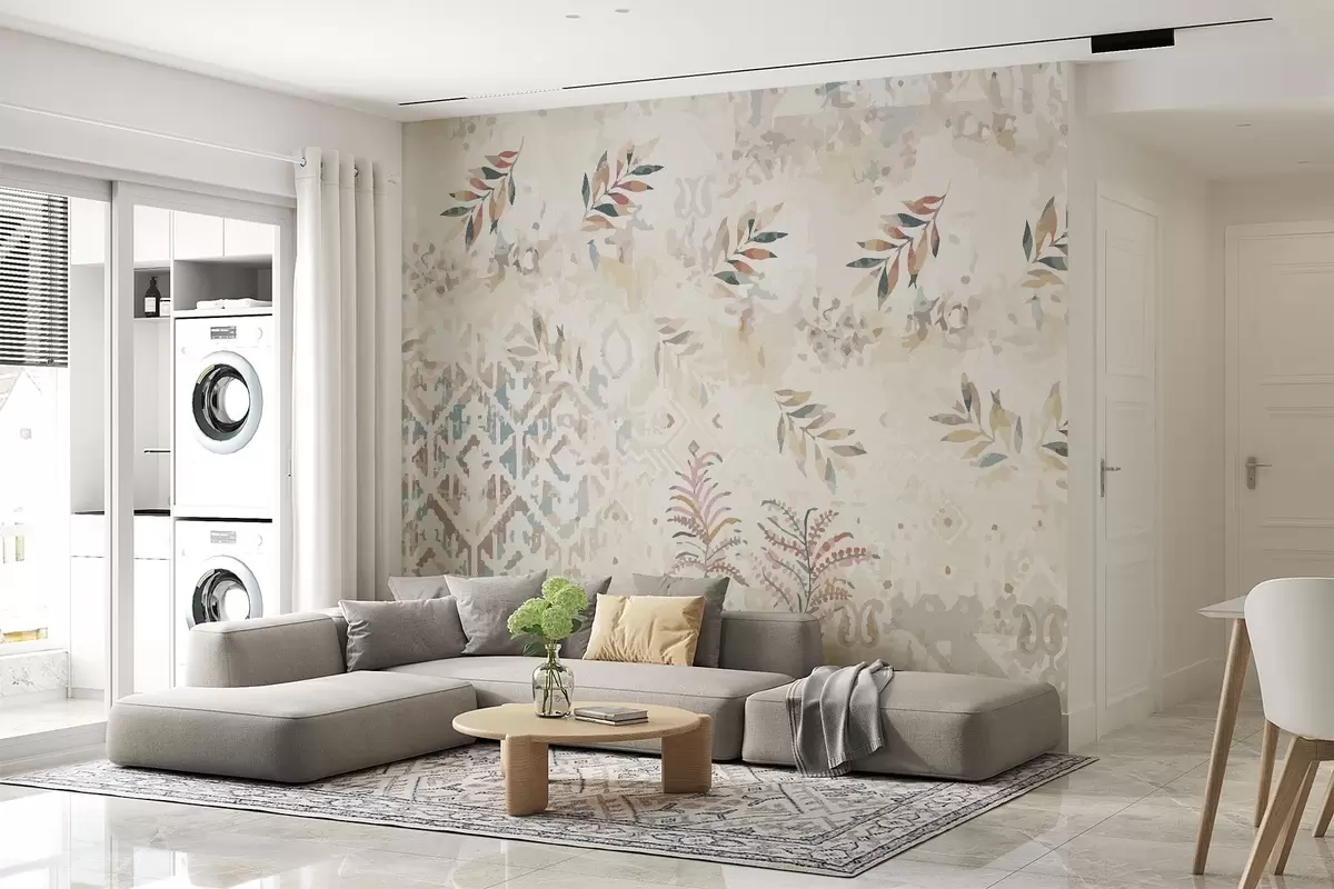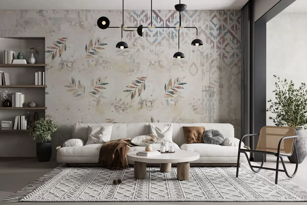 Fototapeten tapete im Retrostil mit Mustern, Elementen von Abrieb, Flecken und Blättern, mit kalten Beigetönen N° w01955v2