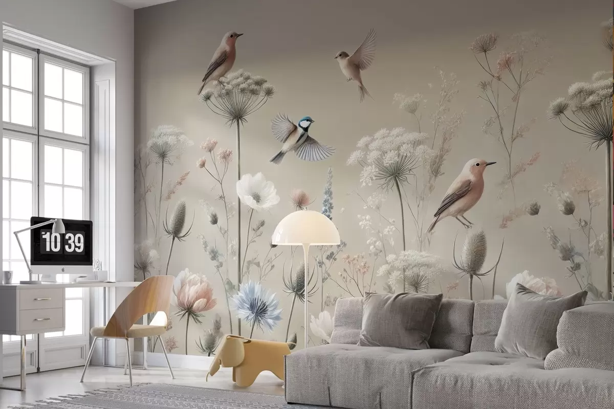 Fototapeten Zarte Wildblumen mit Vögeln auf einem beigen Hintergrund N° w01958