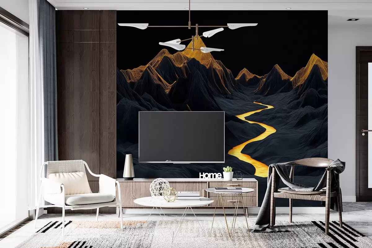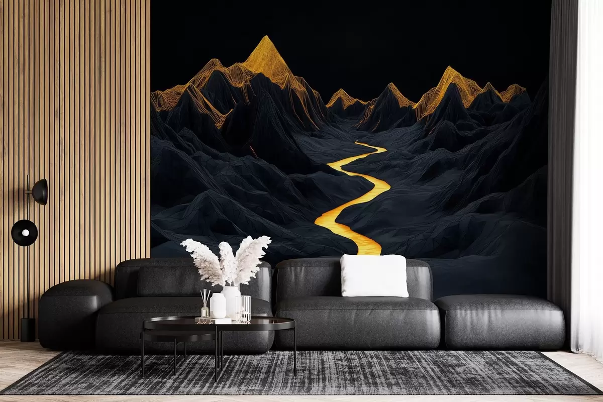 Fototapeten Polygonale schwarze Landschaft und ein Fluss zwischen den Bergen N° w02063