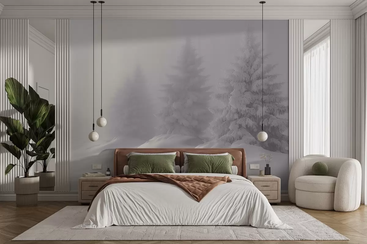Fototapeten Verschneite Tannenbäume in der Einsamkeit eines nebligen Morgens N° w02065