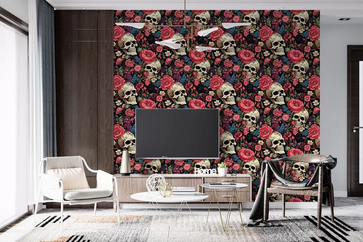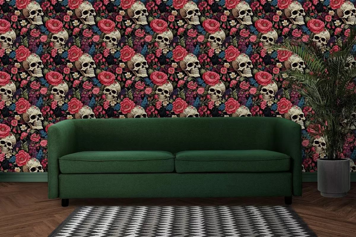 Fototapeten Mystische Tapete im Retrostil mit Totenkopfmuster und Blumen in Rosatönen auf dunklem Hintergrund N° w02084